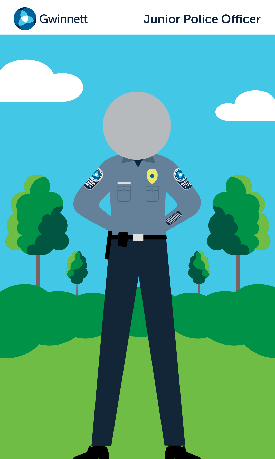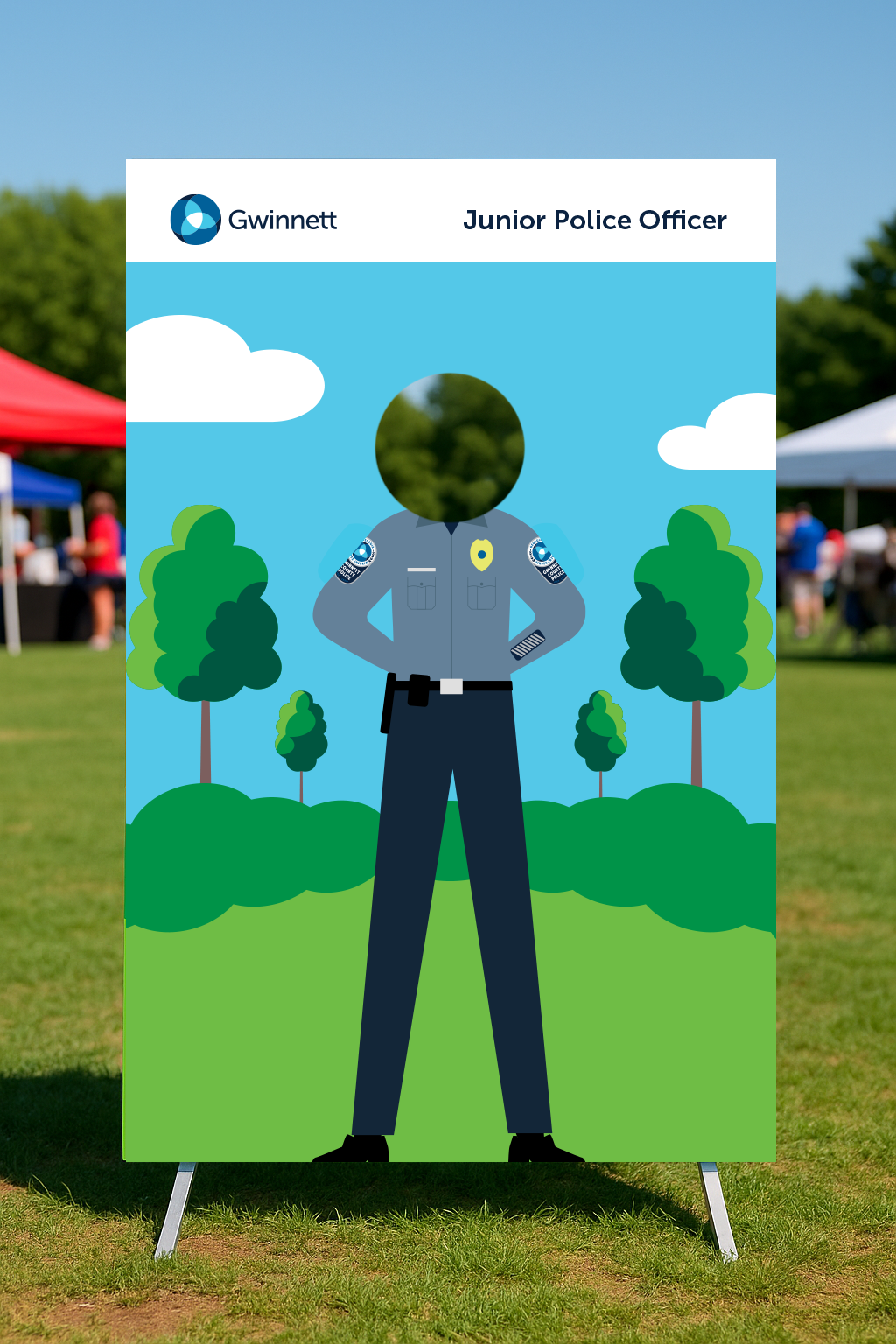 Created for the department’s Public Fall Safety Festival, this life-sized, kid-friendly standee invites children to step into the role of a “Junior Police Officer.” Designed in Adobe Illustrator, the piece aligns with Gwinnett’s brand guidelines while incorporating approachable, vibrant visuals for community engagement. The cutout height and proportions were carefully adjusted for children around 4 feet tall, ensuring an inclusive and interactive experience at public events.